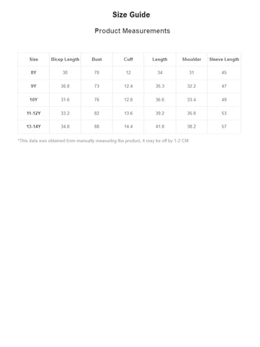 eleven-12 Years: Bicep Duration: 33.2″, Bust: 82.zero”, Cuff: 13.6″, Duration: 39.2″, Shoulder: 35.eight”, Sleeve Duration: 53.zero”