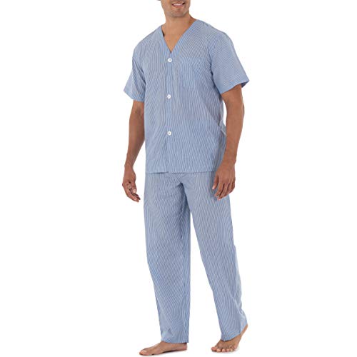 These quality pajamas will keep you cool and comfortable. Constructed with easy care fabric, these pajamas are soft and smooth. The V neck styled top features a button front and patch pocket. The pants have a covered elastic waistband with an adjustable button closure and button fly.
