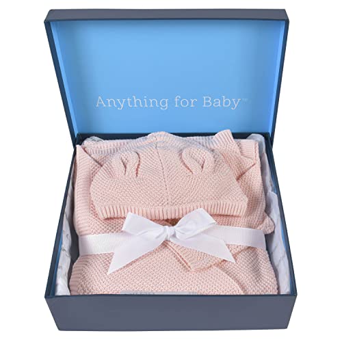 A perfect baby shower gift, comes beautifully packaged in a gift box. Features moss stitch sweater knit fabric.