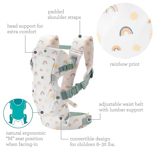 “With its all-new stylish rainbow print, the Infantino Flip 4-in-1 Convertible Carrier just got better! This is the carrier for you if you wish to carry your baby in style. But this carrier is more than just chic – it also features four convertible carrying positions that can be utilized at appropriate developmental milestones from newborn to toddler (8-32 pounds). So whether you’re walking in the park with your facing-in newborn or exploring a museum with your toddler in back carry position, hands-free convenience and close bonding moments are all the time within reach. Plus, the carrier is customizable to verify a comfortable fit for both baby and parent. An adjustable supportive waistband, head give a boost to, ergonomic seat, and padded shoulder straps embrace many different body types and lifestyles, making this carrier an excellent option. It’s no wonder why the Infantino Flip 4-in-1 Convertible Carrier is The us’s best-selling carrier – it’s practical, affordable, parent-approved, and now in 3 new chic prints, including leopard, camo, and rainbow! Spice up your baby-wearing style with the all-new Flip 4-in-1 Convertible Carrier! “