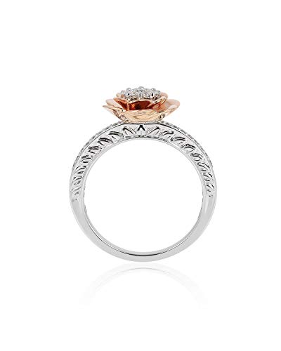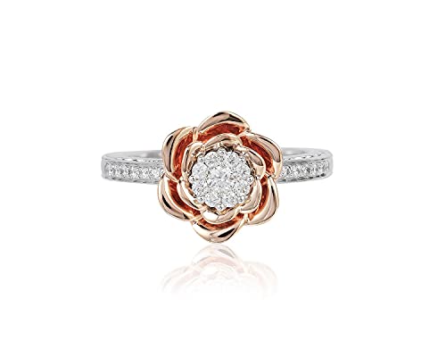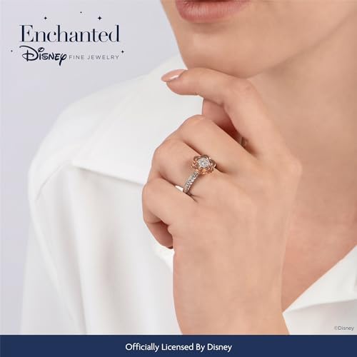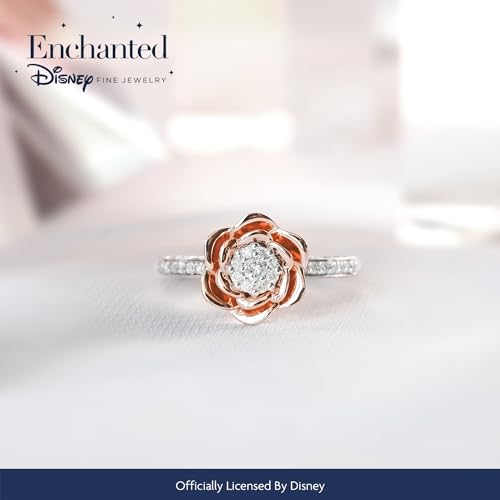 A blossoming jewelry that can add character to your looks. Inspired by Belle, this Diamond Rose Ring is part of the Enchanted Disney Fine Jewelry Collection and has a charming beauty that will add oomph to your outfits. The band is crafted from sterling silver and is lined on the sides with diamonds. On the center is a sterling silver rose in 14k gold plating. Diamonds on the center of the rose make this everyday jewel twinkle an even prettier sparkle.