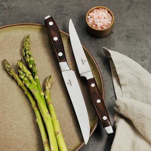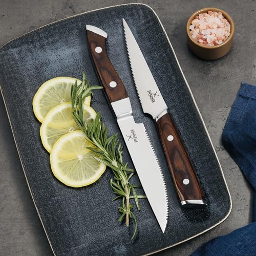 You have a choice: еry this special steak knives set: they balanced another way and have different levels of serration, it’s more flexibility and versatility. It’s the safer purchase for the intended purpose because it’s the variety set. Best wood steak knives are great to say thank you gift for men. We recommend only hand wash each time after use to increase the service life and quality of steel.