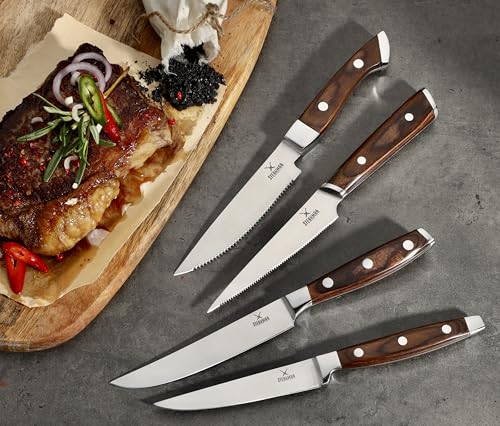 The right knife for your steak: steak knives serrated blade edge for medium, medium well and well done steaks. Non serrated steak knives for blue rare, rare, medium rare steaks. This steak cutlery set you’ll use for beef, turkey, poultry, pork, for non meat items. 4 stainless steel steak knives set is odd gift for home, great bbq gifts for men, meat lovers gifts, holiday gifts for men and women, gift for family, novel kitchen gadgets, birthday gift for yourself, last minute gifts for men.