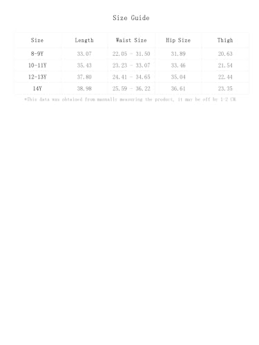 10-11Y:Hip Measurement:33.5IN,Period:35.4IN,Thigh:21.5IN,Waist Measurement:23.2-33.1IN