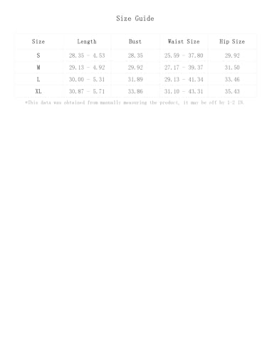 S:Bust:28.3IN,Hip Size:29.9IN,Length:28.3/4.5IN,Waist Size:25.6-37.8IN