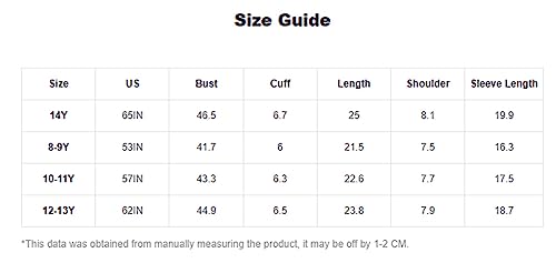14 Years: Shoulder: 8.1″, Period: 25.zero”, Sleeve Period: 19.nine”, Bust: 46.five”, Cuff: 6.7″
