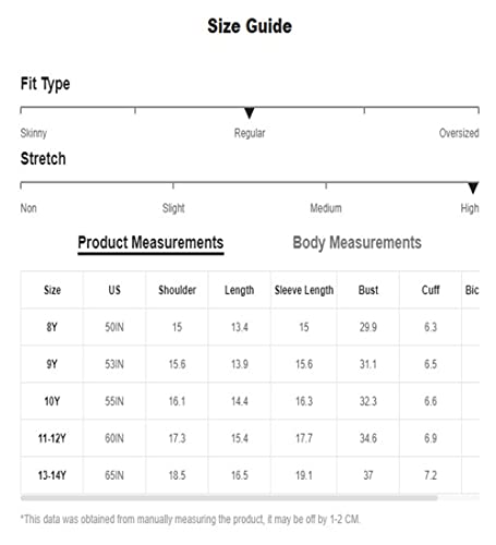 9 Years: Bicep Duration: 12.1″, Bust: 31.1″, Cuff: 6.five”, Duration: 13.nine”, Shoulder: 15.6″, Sleeve Duration: 15.6″