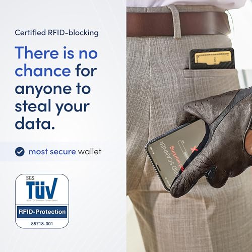 ππ ππππππππ – The RFID blocking function of our front pocket wallet has been certified by the independent institute TΓV Germany for completely blocking the RFID frequency 13.56 MHz. This protects your cards in the aluminum frame and also the front pocket from being read